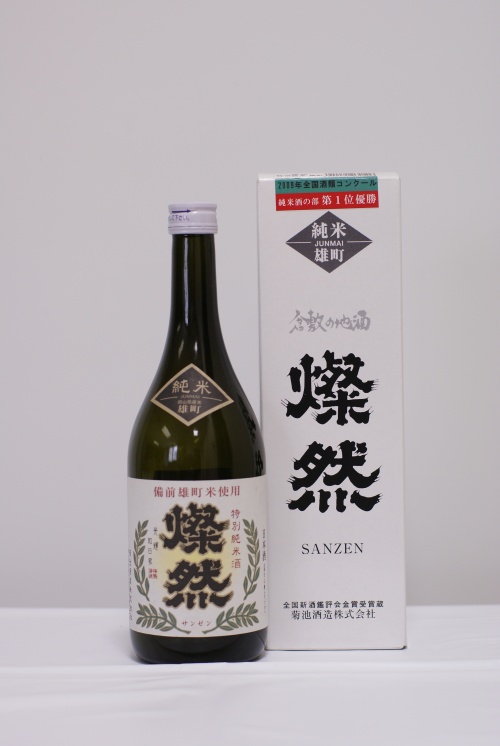-旨みがあってキレの良い、一度飲んだら忘れられないようなお酒-  菊池酒造の追い求めるこの理想のお酒を実現すべく、平成8年、社長・菊池東が自ら杜氏に就任。“伝統を育み、未来に伝えるこだわりの美酒づくり”をモットーに、社長杜氏の手でもって洗米からしぼりまでの全工程においてきめ細やかな酒造りを行っています。モーツァルトの音楽が流れる蔵の中で、兵庫の山田錦・岡山の雄町・朝日といった酒造りに適した最良の米、優れた水質を誇る高梁川の伏流水とで醸された「燦然」は、幅のあるなめらかな旨さと、あとギレのよいやや辛口な味わいのお酒として、倉敷の地酒として広く親しまれています。